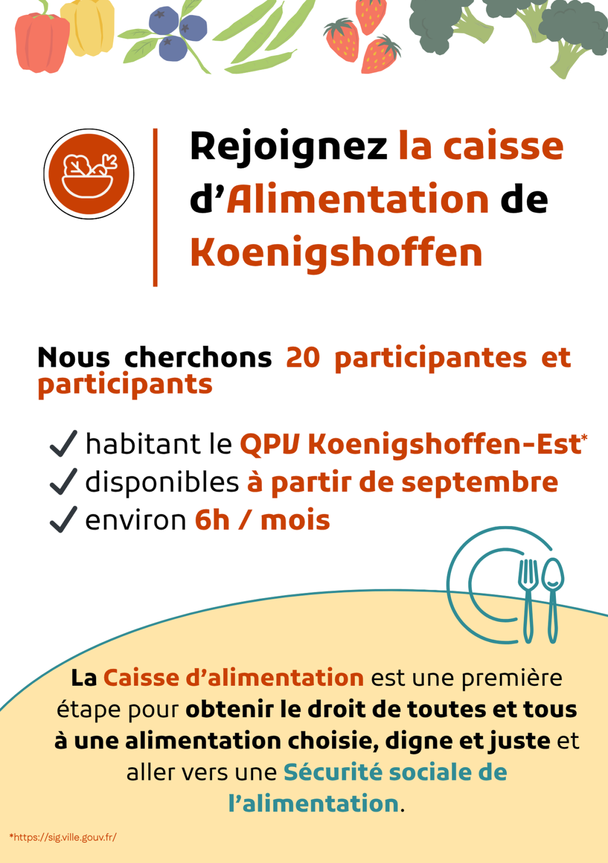 Si nous avons plus de 20 personnes volontaires, nous procéderons à un tirage au sort en nous appuyant sur 2 objectifs de représentativité : 41% de personnes vivant sous le seuil de pauvreté ; 30% de familles monoparentales (chiffres actuels du Quartier Prioritaire de la Ville de Koenigshoffen-Est : SIG Politique de la Ville)