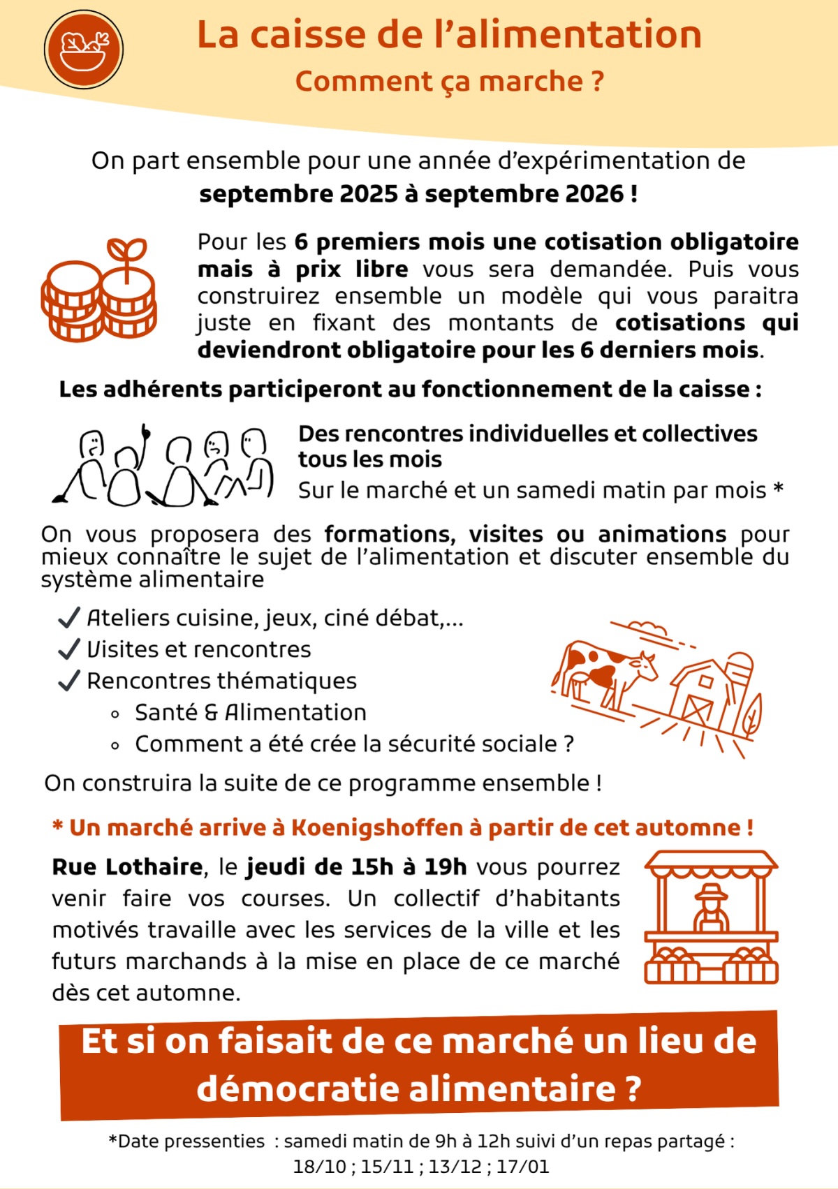 En tant que mangeur·euses je reçois tous les mois 100 € pour mes dépenses alimentaires pour mes achats sur le futur marché de Koenigshoffen (Rue Lothaire les jeudi de 15h à 19h). Une cotisation à prix libre vous sera demandée les 6 premiers mois, puis vous construirez ensemble le modèle pour les 6 mois suivants.